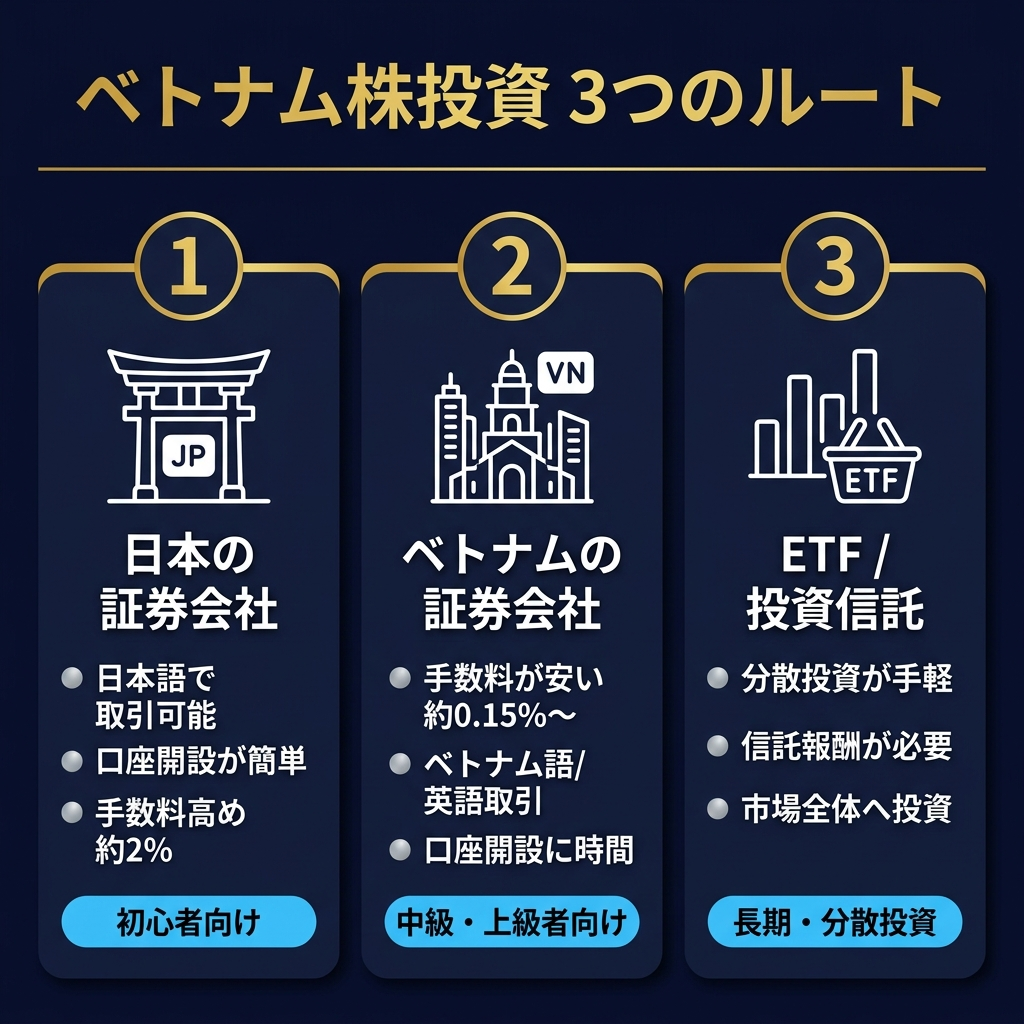 ベトナム株を買うルートは、大きく分けて3つあります。