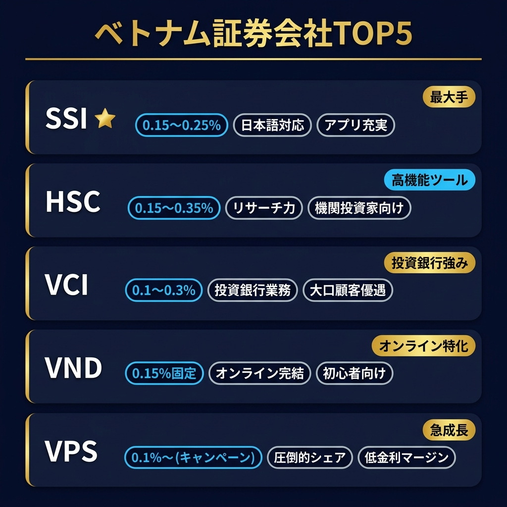 SSI証券は、ベトナム最大級の証券会社で、日本語対応スタッフが在籍しています。手数料は0.15~0.25%で、オンライン取引やスマートフォンアプリにも対応。外国人投資家への対応実績が豊富で、口座開設から取引開始まで比較的スムーズです。