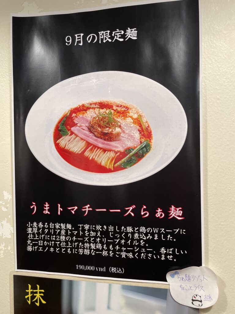 ハノイの日本人に愛され続けているラーメン店「らぁ麺春樹」から、9月限定の新メニューが登場しました。その名も「うまトマチーズらぁ麺」!イタリアンテイストのラーメンということで、さっそく食べに行ってきました。