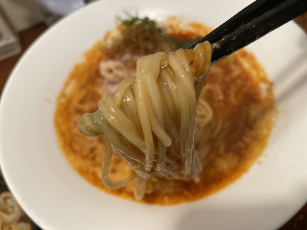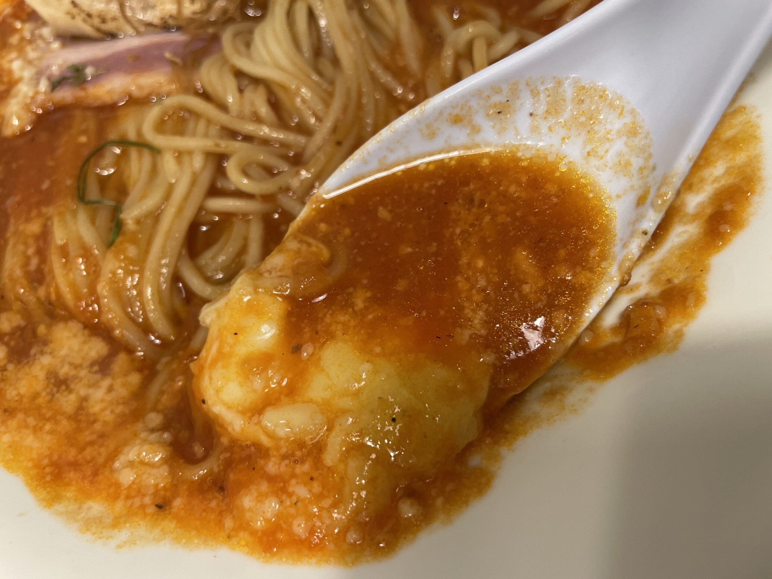 一口スープを飲んでみると、これはもうラーメンというよりもパスタに近い感覚!濃厚なトマトの酸味と甘味、そしてチーズのコクが絶妙にバランスされています。豚と鶏のWスープがベースになっているため、日本人好みの深い旨味もしっかりと感じられます。